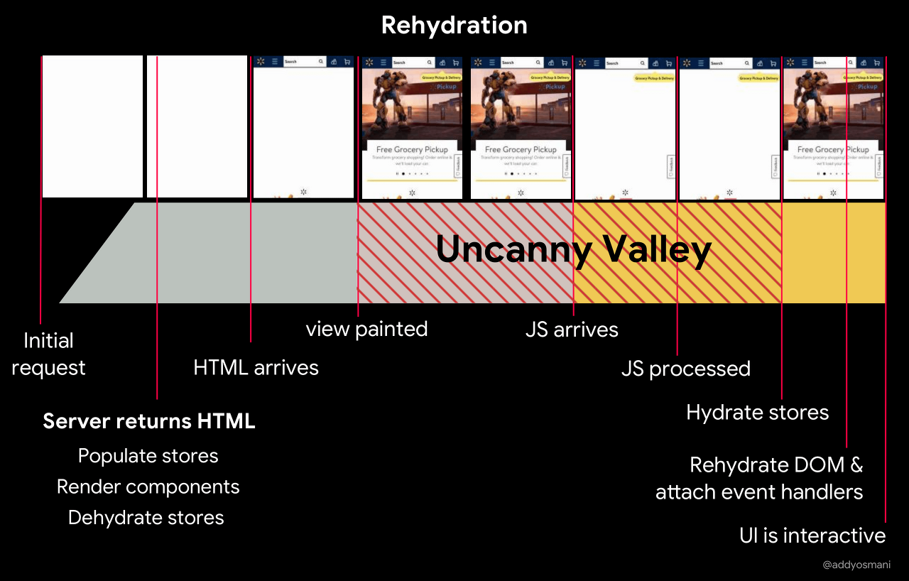 그리고 React가 번들링된 자바스크립트 코드들을 클라이언트에 전송하여 js 코드를 통해 웹 화면을 렌더링 하며 클릭과 같은 이벤트 리스너들을 적용시키는 즉, 수분을 채워넣는 일련의 Hydrate 과정이 일어난다. 그리고 우리는 dehydrate시킨 값을 hydrate시키는 것이므로 클라이언트에 rehydrate 시킨다고 표현한다.